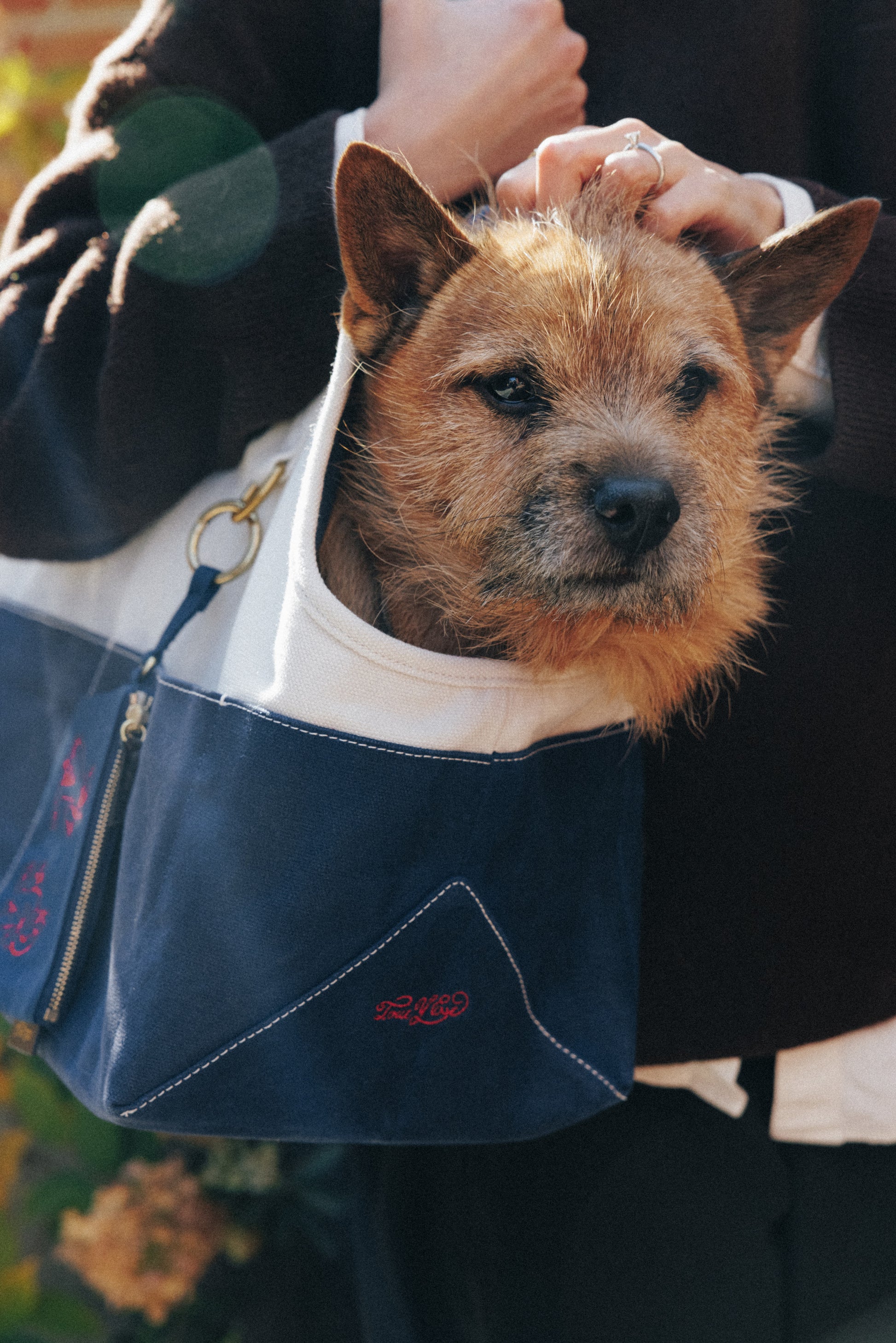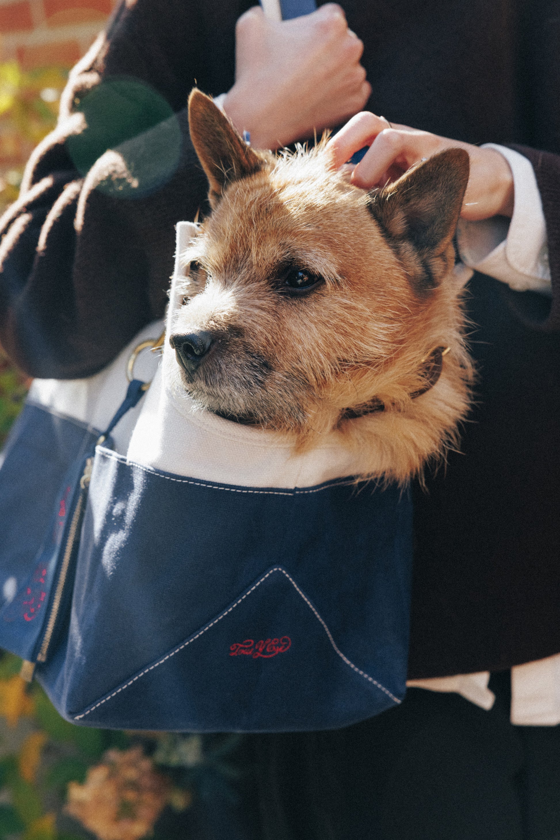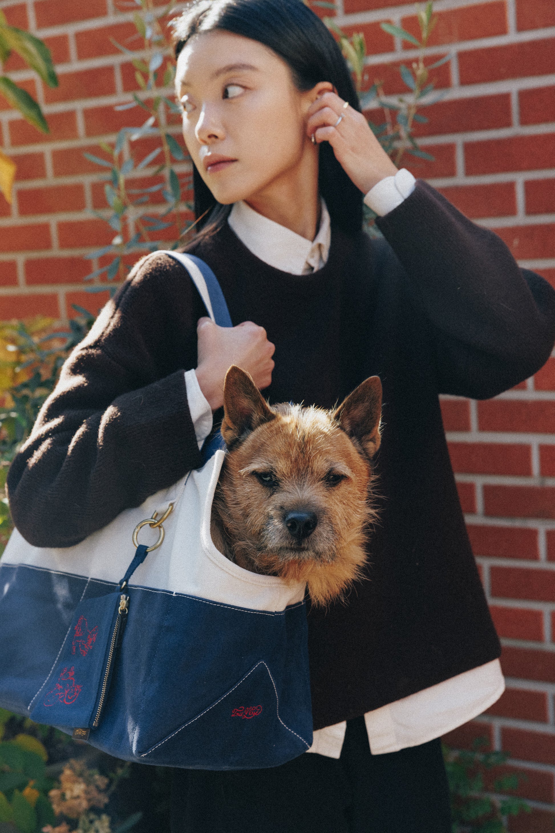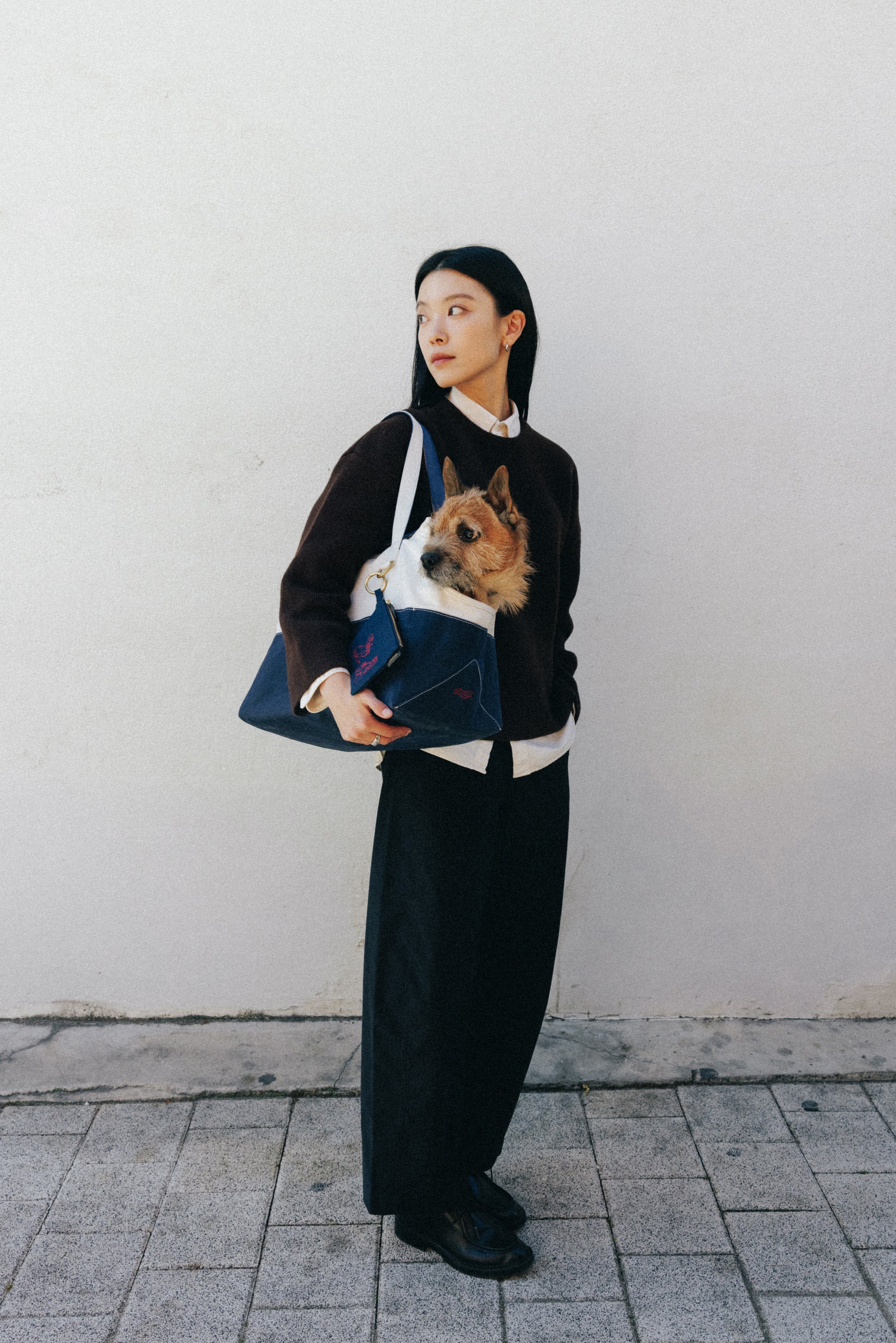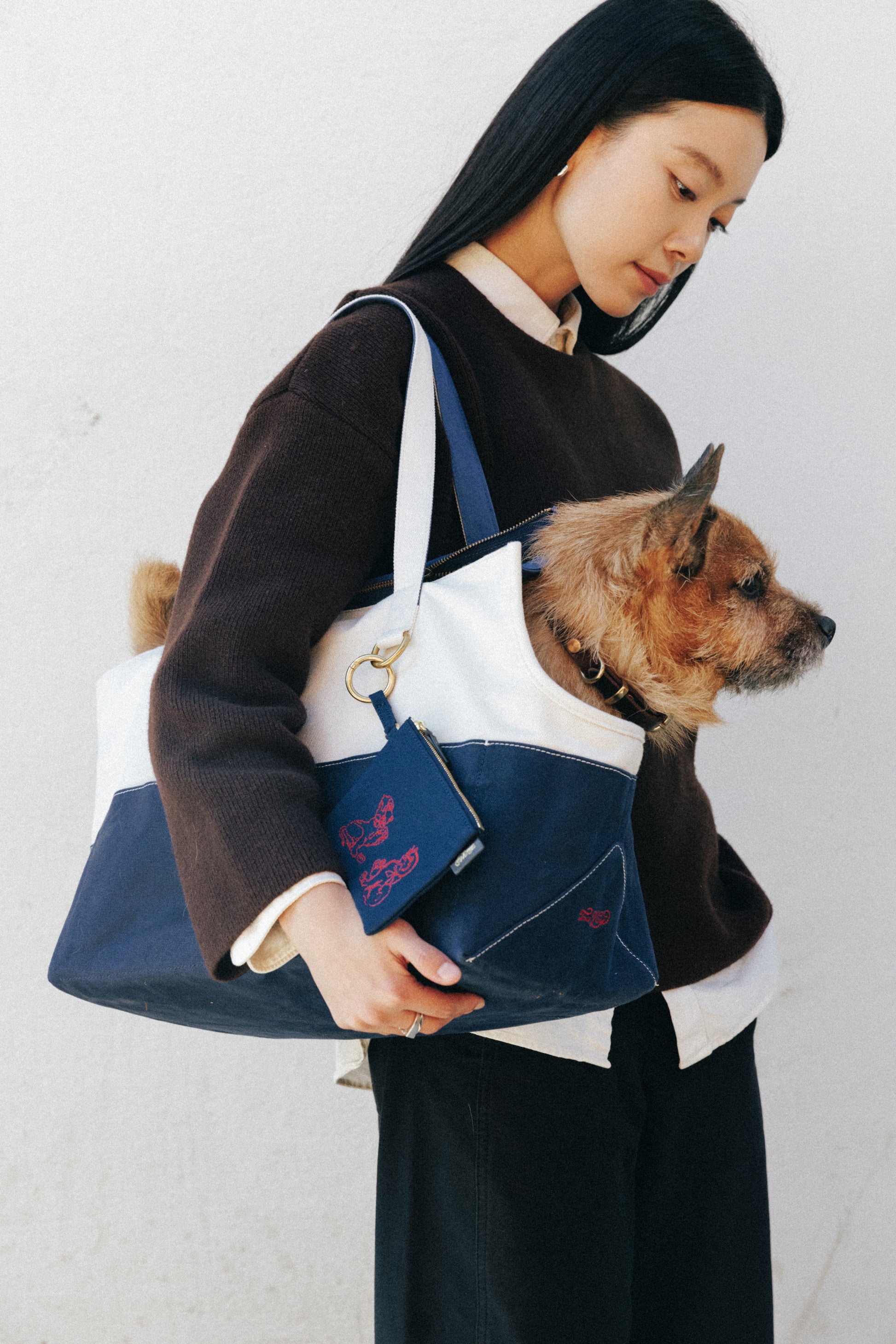 코튼 캔버스 원단과 브라스로 제작된 반려동물용 캐리백입니다. 하단 네이비 부분은 왁스 코팅 처리된 캔버스를 사용해 오염에 강하며, 가방의 형태를 안정적으로 유지하는 바닥 지지판은 필요에 따라 탈착이 가능합니다. 전면과 후면 총 네 곳에 넉넉한 크기의 포켓이 있어 산책이나 이동 시 필요한 소지품을 수납하기에 편리합니다. 내부에는 반려동물의 안전을 위한 고정용 스트랩이 있으며, 윗부분은 지퍼 덮개로 여닫을 수 있습니다. 지퍼 덮개 상단에는 로고 라벨이 부착되어 있고, 측면에는 ‘TOUT Y EST’ 자수와 금박 로고 가죽 탭이 각각 위치합니다.