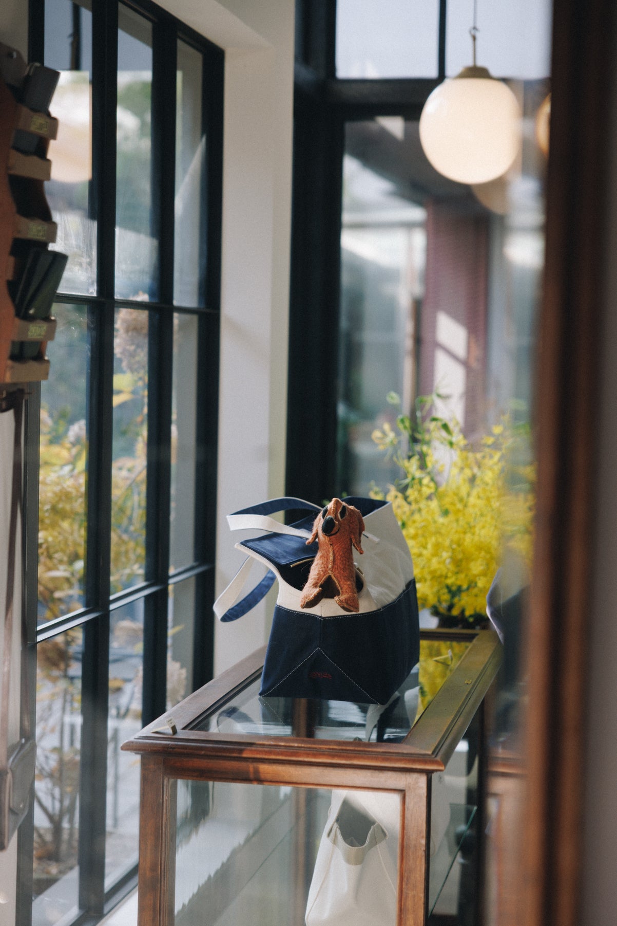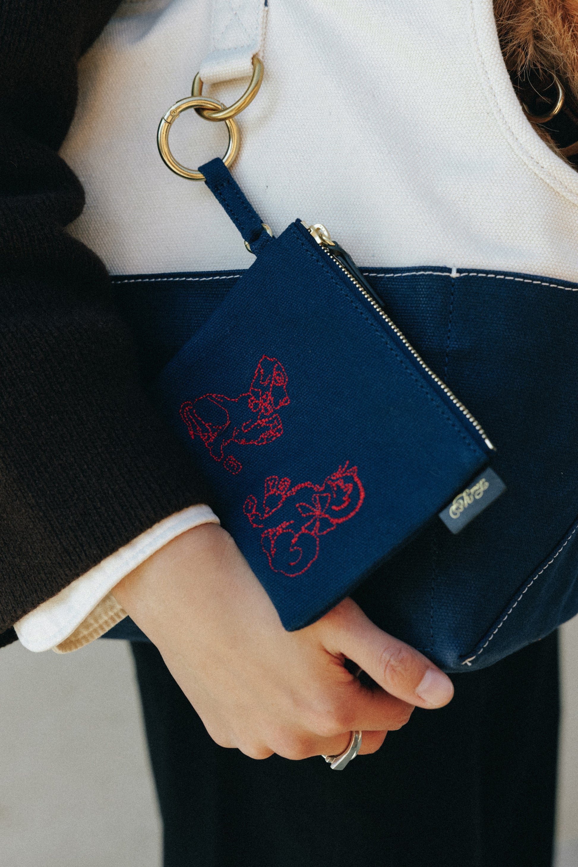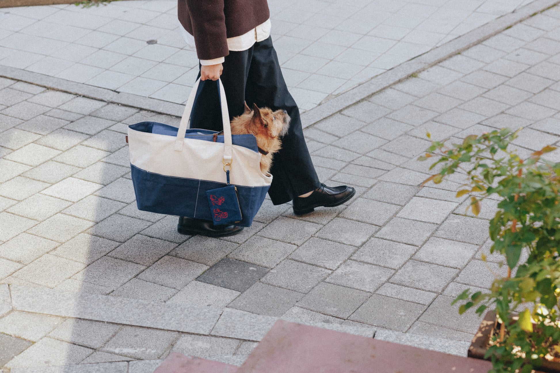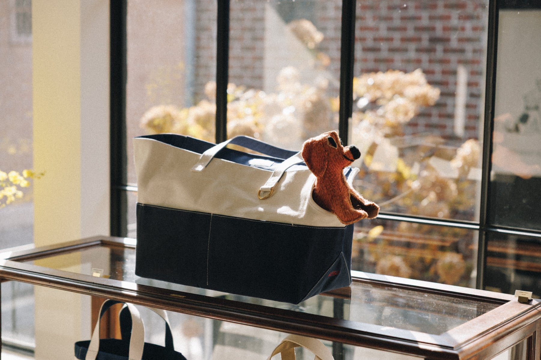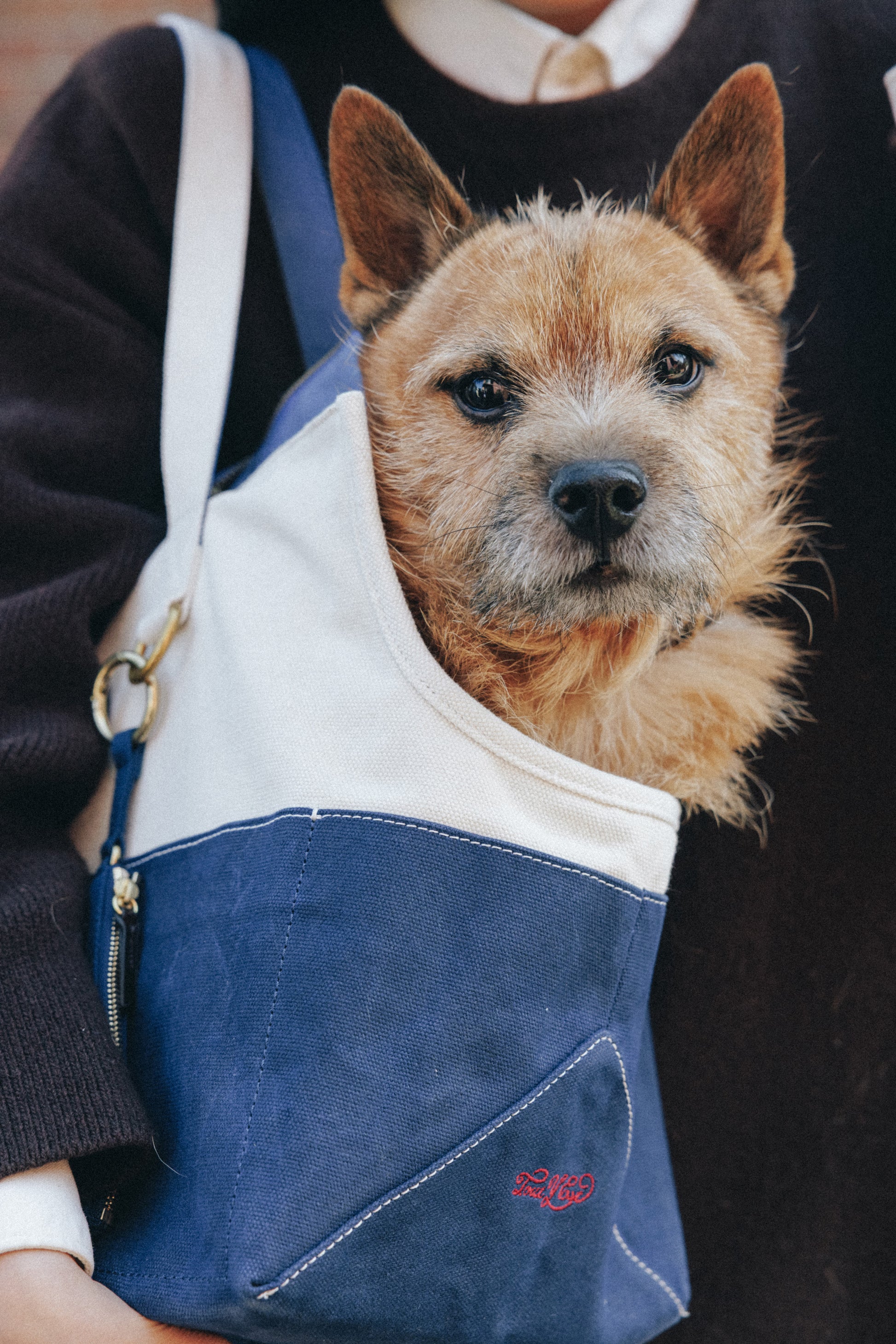 코튼 캔버스 원단과 브라스로 제작된 반려동물용 캐리백입니다. 하단 네이비 부분은 왁스 코팅 처리된 캔버스를 사용해 오염에 강하며, 가방의 형태를 안정적으로 유지하는 바닥 지지판은 필요에 따라 탈착이 가능합니다. 전면과 후면 총 네 곳에 넉넉한 크기의 포켓이 있어 산책이나 이동 시 필요한 소지품을 수납하기에 편리합니다. 내부에는 반려동물의 안전을 위한 고정용 스트랩이 있으며, 윗부분은 지퍼 덮개로 여닫을 수 있습니다. 지퍼 덮개 상단에는 로고 라벨이 부착되어 있고, 측면에는 ‘TOUT Y EST’ 자수와 금박 로고 가죽 탭이 각각 위치합니다.