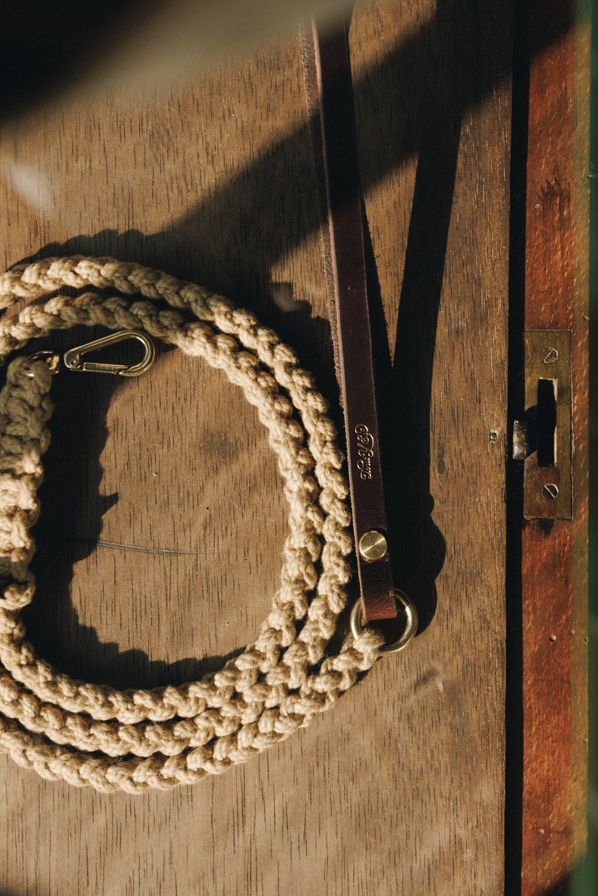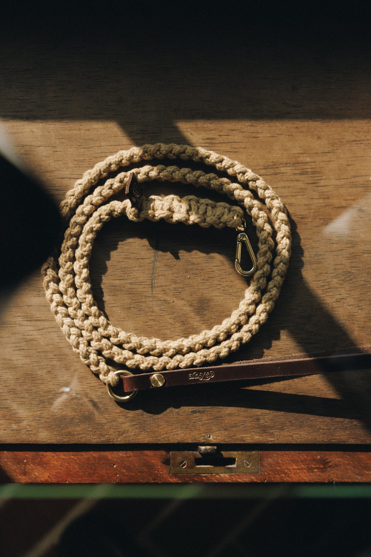 이탈리아산 소가죽, 브라스, 코튼 로프로 제작된 강아지용 리쉬입니다.