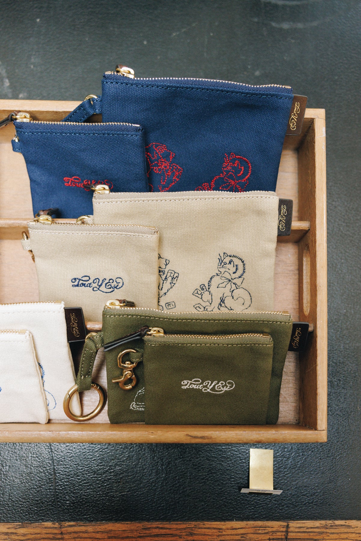 코튼 캔버스 원단과 브라스로 제작된 파우치입니다. 산책 시 견주의 작은 소지품을 담거나, 강아지 간식 · 여분의 배변봉투 · 물티슈 등을 보관하는 다양한 용도로 사용할 수 있습니다. 앞면에는 강아지와 고양이 자수가 놓여 있으며, 지퍼 손잡이는 소가죽으로 마감되었습니다. 측면의 가죽 탭에는 ‘TOUT Y EST’ 금박 로고가 각인되어 있습니다. O링 스트랩이 달려 있어 캐리백이나 리쉬에 연결할 수 있으며, 산책용뿐 아니라 가방의 액세서리로도 활용할 수 있습니다.