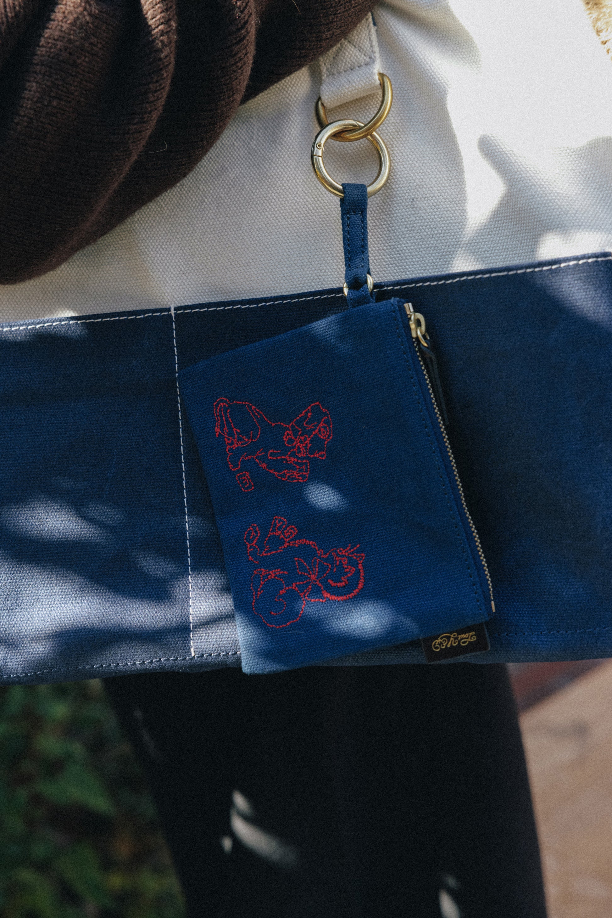 코튼 캔버스 원단과 브라스로 제작된 파우치입니다. 산책 시 견주의 작은 소지품을 담거나, 강아지 간식 · 여분의 배변봉투 · 물티슈 등을 보관하는 다양한 용도로 사용할 수 있습니다. 앞면에는 강아지와 고양이 자수가 놓여 있으며, 지퍼 손잡이는 소가죽으로 마감되었습니다. 측면의 가죽 탭에는 ‘TOUT Y EST’ 금박 로고가 각인되어 있습니다. O링 스트랩이 달려 있어 캐리백이나 리쉬에 연결할 수 있으며, 산책용뿐 아니라 가방의 액세서리로도 활용할 수 있습니다.
