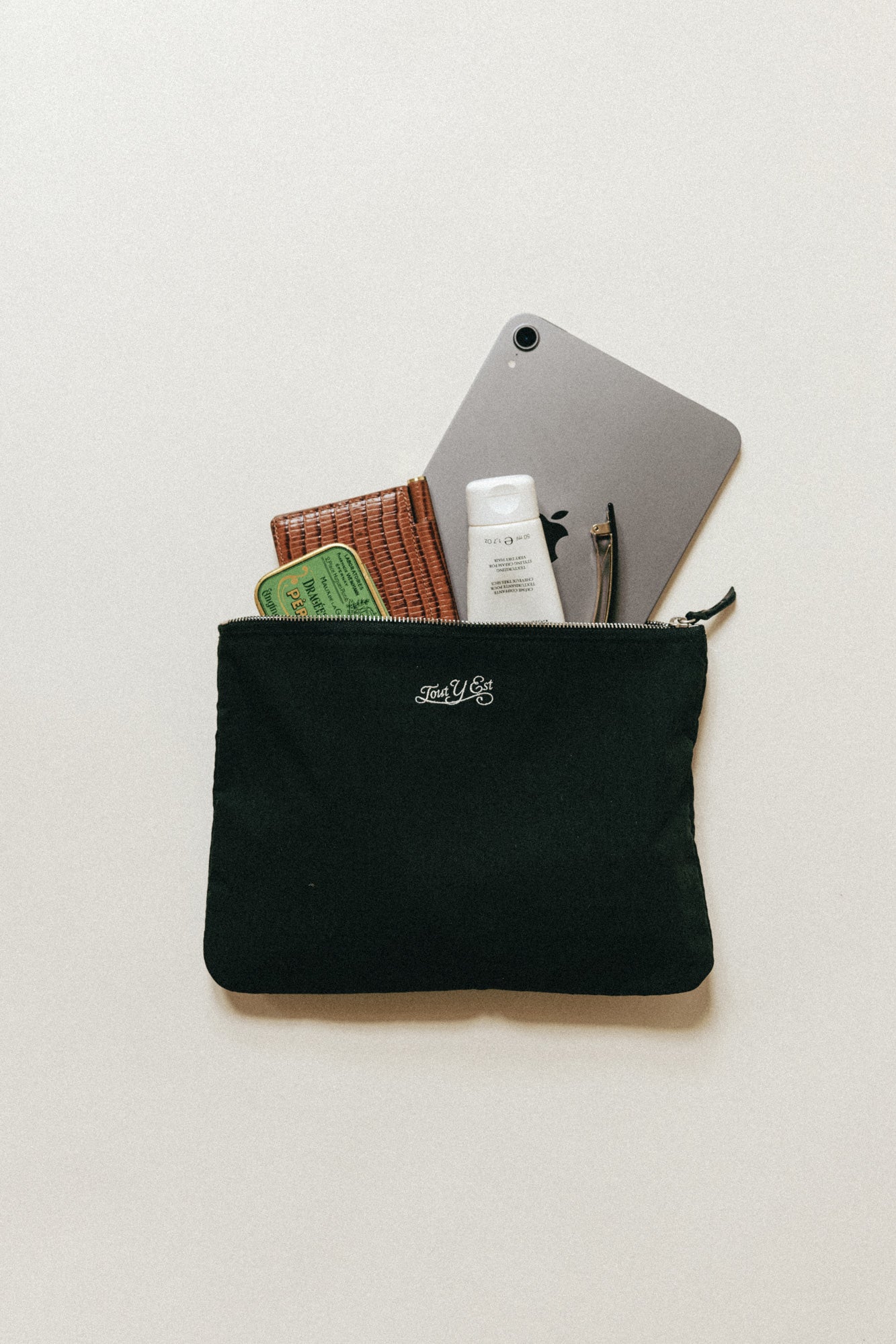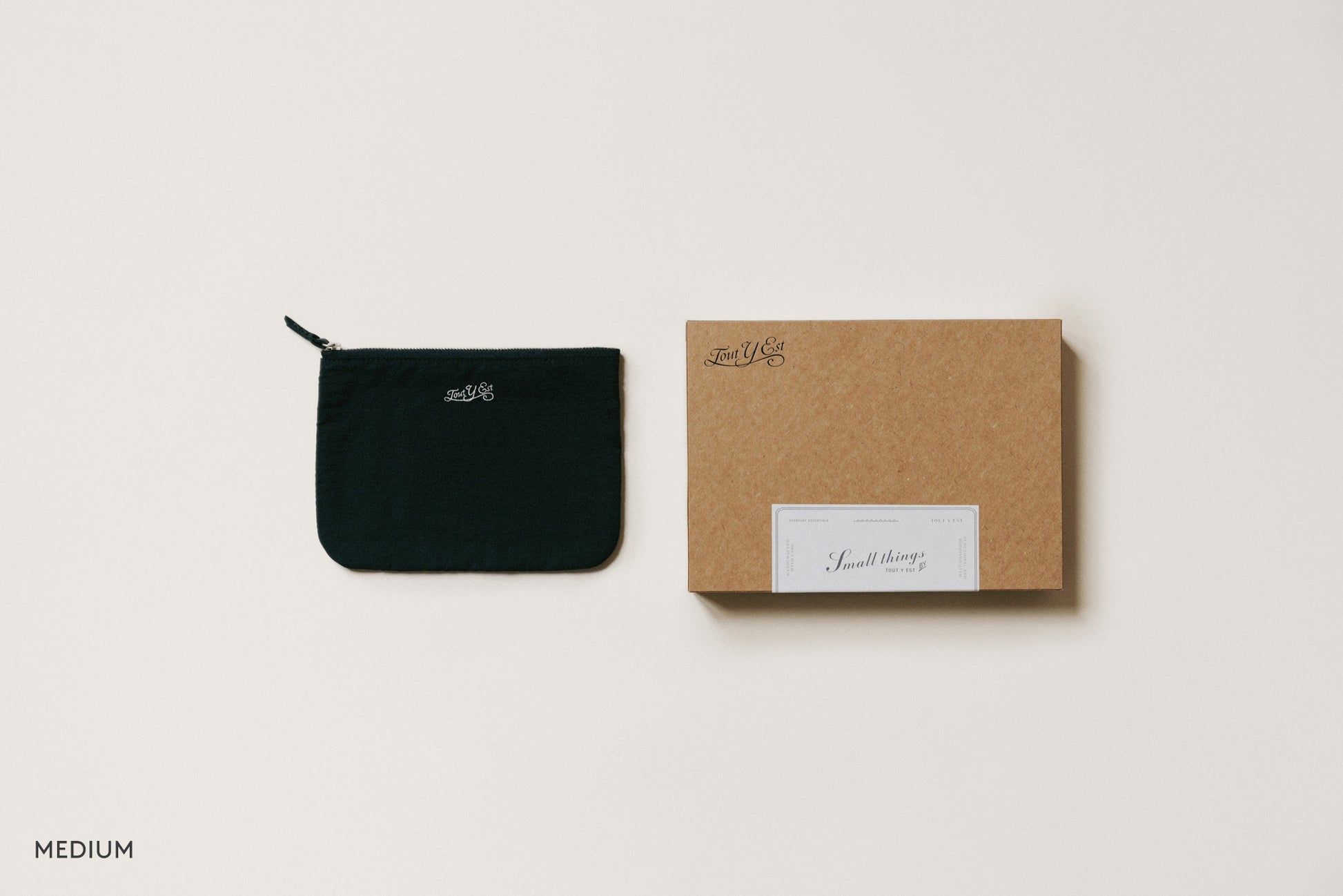 일상에서 필수품을 간편하게 정리하고 휴대하기 좋은 직사각 형태의 파우치입니다. 부드러운 지퍼는 가죽 풀러가 달려 있어 사용이 편리하며, 내부에 포켓이 있어 흩어지기 쉬운 작은 소지품도 깔끔하게 수납할 수 있습니다. 전면에는 투티에 로고를 자수로 새겨 넣었고 겉감과 동일한 소재로 안감을 제작하여 완성도를 높였습니다.