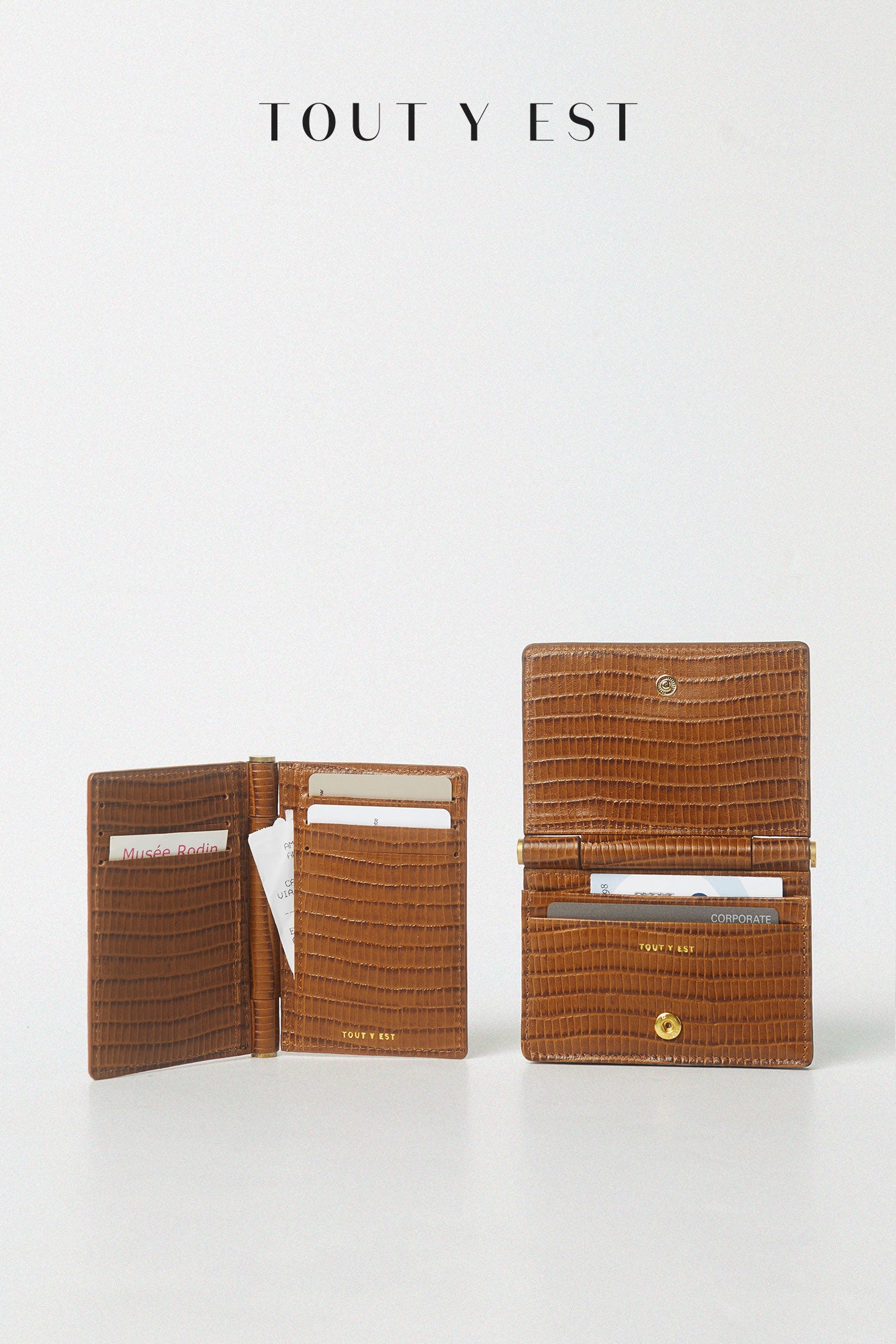 투티에의 상징적인 브라스 바 장식을 사용한 포멜 명함지갑은 바를 중심으로 플랩이 완전히 젖혀질 수 있는 구조로 소지품을 편안하게 넣고 꺼낼 수 있습니다. 넓은 칸과 카드 슬롯으로 분리되어 있어 자주 사용하는 카드를 별도로 수납하기에 용이합니다. 스냅을 사용하여 여닫을 수 있으며 10장 내외의 카드 수납이 가능합니다.
